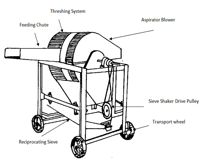 सिद्धांत: थ्रेसिंग डंठल से अनाज को अलग करती है. इसमें मुख्य रूप से एक नुकीला घूमने वाला सिलेंडर और अवतल होता है।सिलेंडर के आगे वाले हिस्से में फीडर होता है और थ्रेशर के लिए अनाज डालने हेतु इसकी ऊंचाई को समायोजित किया जा सकता है।नुकीले दांत वाला सिलेंडर और अवतल कुछ कम्बाइनों पर उपलब्ध होता हैं; थ्रेसिंग की जा रही विभिन्न फसलों के अनुरूप सिलेंडर की गति को समायोजित करने की सुविधा होती है। अगल किए जाने वाले तंत्र के द्वारा पुआल पिछे की ओर फेंक दिया जाता है जबकि अनाज अवतल के माध्यम से सिलेंडर के नीचे अनाज पैन पर गिरता है।